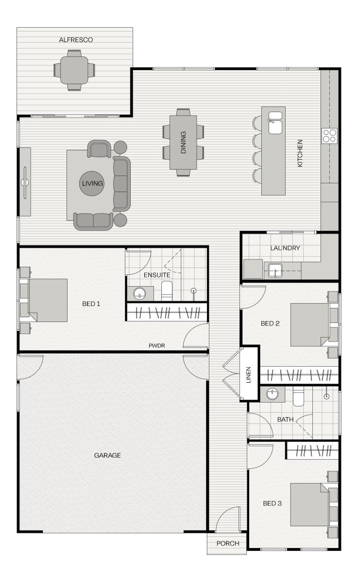 The Asher is made for moments worth sharing. With three bedrooms, including a main with an ensuite, there’s room for guests, hobbies, or simply spreading out. Each bedroom comes with built-in robes, while the open-plan living, dining, and kitchen area is the true heart of the home. Cook up a storm in your sleek modern kitchen, then flow straight out to the spacious deck for long lunches, sunset drinks, or weekend celebrations.