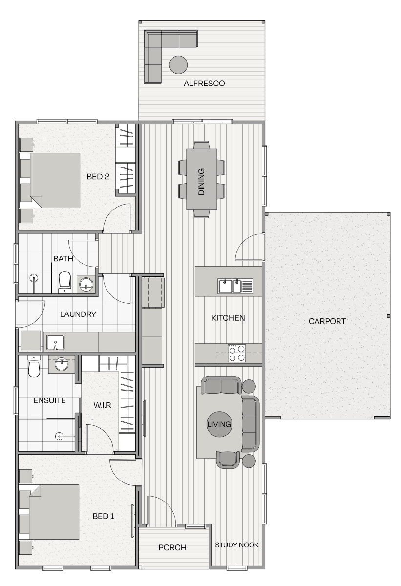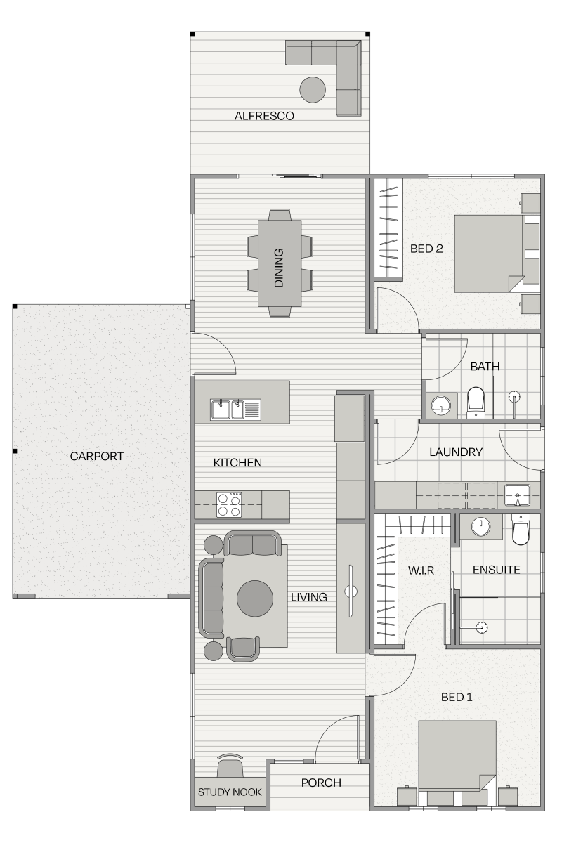 The Camden is a thoughtfully designed home featuring two bedrooms, the main with a walk-in wardrobe and ensuite. The open plan layout encompasses a modern kitchen with a breakfast bar, a bright, airy dining space, and an oversized living room with study nook. A single carport provides secure parking, and the outdoor deck is the ideal place to unwind. Complete with a welcoming front porch, family bathroom, and large laundry, the Camden is the perfect home.