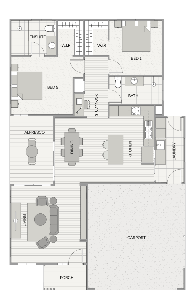 Whether you’re hosting a dinner party or a pizza party, you’ll love cooking up a storm in your contemporary kitchen. Two generous bedrooms feature spacious walk-in robes and offer the perfect peaceful retreat, while the study nook is a great little hideaway. With a two-car carport and clever storage, The Emerson has all you need to start your next chapter.