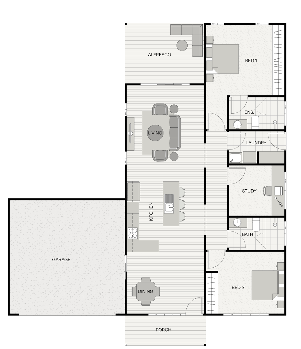 The Hawthorn brings together space, style, and everyday ease. Two bedrooms, including a main with an ensuite, plus a family bathroom, built-in robes, and a private study, give everyone room to relax, work, or unwind.
