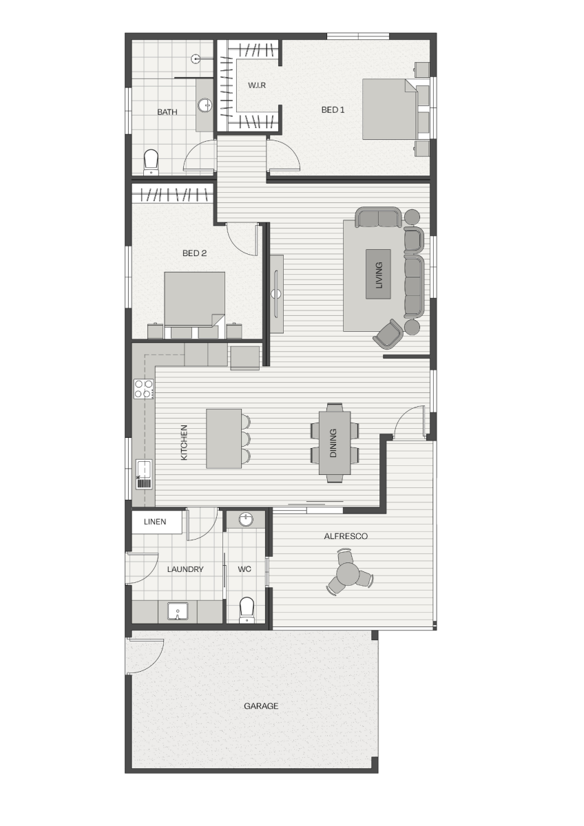 Two comfortable bedrooms are well positioned for privacy, with the main bedroom featuring a walk-in robe and convenient access to the central bathroom. With a functional layout, practical storage and a seamless indoor–outdoor connection, The Myrtle is a home that balances comfort, connection and simplicity with ease.