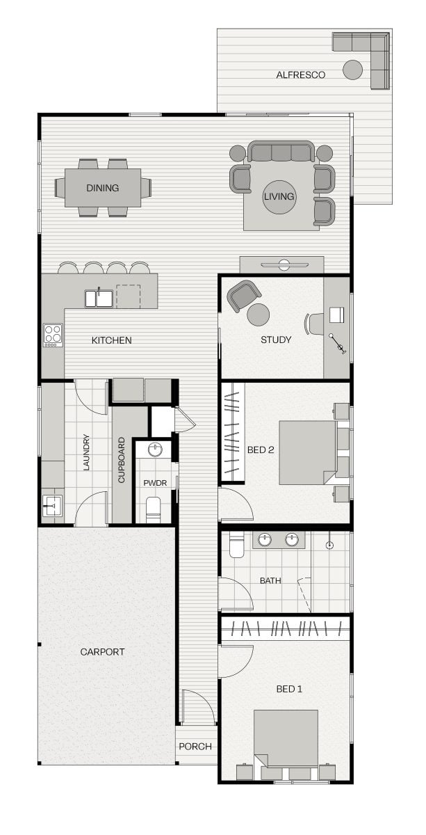 The Seattle SX is a stylish home enriched with contemporary amenities. Upon entry, you’ll be greeted by a well-illuminated and welcoming hallway leading to a functional open-plan living, dining, and kitchen area. This house also comprises two bedrooms, each boasting built-in wardrobes, a family bathroom, a separate powder room, and a study. To enhance convenience, the laundry area is easily accessible directly from the carport.